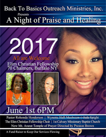 Elim Christian Fellowship in Buffalo will be the site of an uplifting evening of gospel music featuring some of the brightest lights in Buffalo's vibrant gospel community: Pastor Rhonda Henderson; Wynetta Hall-Meelveen; Jada Spight; and three choirs - The Elim Christian Fellowship Choir, 1st Calvary Missionary Baptist Church and New Mt. Ararat Temple of Prayer Directed by Preston Brown. The event runs from 6-8 p.m. at 70 Chalmers Ave., Buffalo. It is a fundraiser for Back to Basics Outreach Ministries.