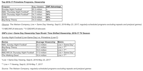 - 6 years in a row - "Sunday Night Football" (2011-12 through 2016-17)