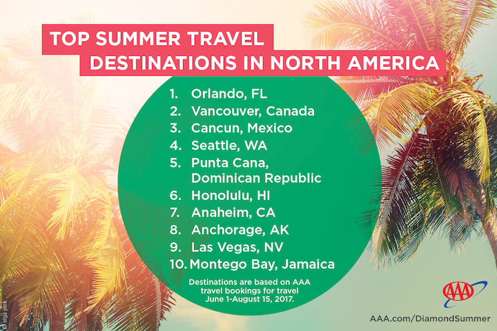 To give travelers a taste of the many great places to stay and dine this summer, they've selected a few of their favorites in the top 10 North American destinations, based on AAA Travel bookings for trips scheduled for June 1 through Aug. 15, 2017.