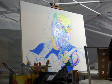 His interpretations of rock 'n' roll icons have caught the attention of music fans in the park. Burke paints outdoor musical artists as they perform on stage just feet away. Once the "live painting" is completed, a full-size, signed and embellished canvas reproduction is raffled off to one lucky fan.