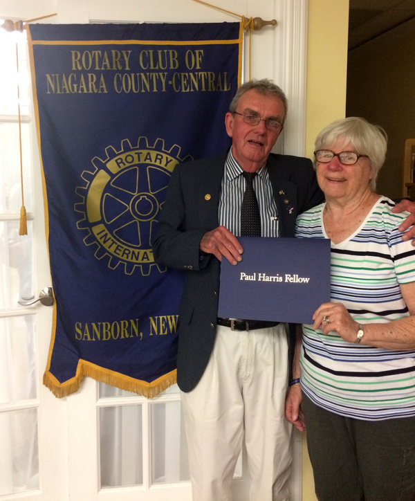 Past President of the Rotary Club of Niagara County Central Tom Grimm stands alongside his wife, Pat, as they display his Paul Harris Fellow Award.