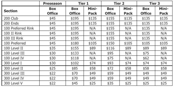 New this season is a fifth 300 Level price category, with prices as low as $25 for individual games. A breakdown of ticket prices for the 2017-18 season is below, denoting box office and mini-pack prices. The full regular-season home schedule with game pricing designations can be downloaded