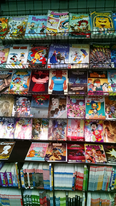 Pulp 716 Coffee and Comics store's walls are covered with shelves showcasing various comic books and pop culture-related merchandise.