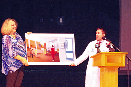 Dr. Stacey Watt, a lifelong Island resident and Kaleida Health's chief of service for anesthesia, challenged the community earlier in the year to raise $25,000 to fund establishment of the room. During the ceremony held at Watt's alma mater, in the Grand Viking Theater of Grand Island High School, Watt presented a check for $25,225 to Amy Habib-Rittling, chair of the John R. Oishei Children's Hospital Capital Campaign.