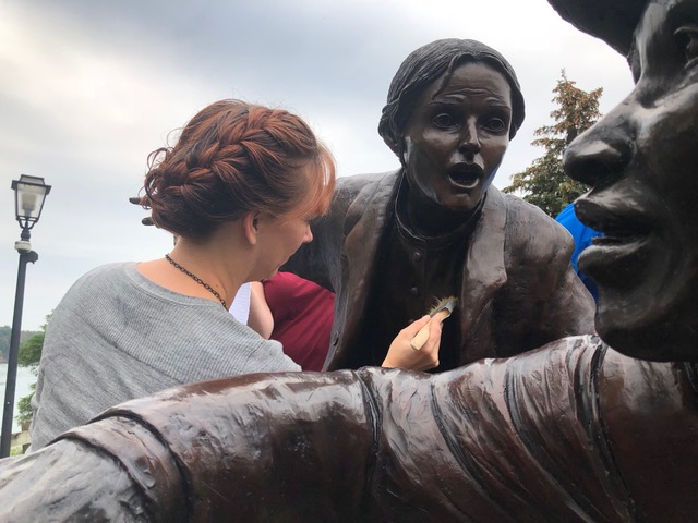 In the second photo, Wydysh is shown applying a light coat of wax to the Laura sculpture. Laura is the principal character in the book "Freedom Crossing," a historical fiction by Margaret Goff Clark that takes place in Lewiston. The book is the best-selling Underground Railroad book of all time.