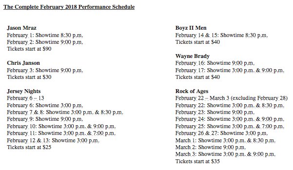 "We are presenting our customers with some fantastic performances throughout February," said Cathy Price, vice president, marketing, Niagara Casinos. "Whether you want to spend a romantic evening listening to Jason Mraz or Boyz II Men, stomp your boots with Chris Janson, be taken back to the '60s with 'Jersey Nights,' laugh till you cry with Wayne Brady, or relive the glory of big-arena '80s rock with 'Rock of Ages,' Fallsview Casino Resort has you covered."