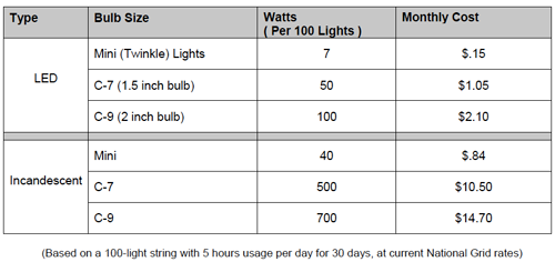 The chart below shows the approximate cost of operating different types of lights at current National Grid rates for residential customers:
