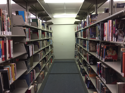 The shelves Niagara University Library are now easily accessible with relevant reading material on display.