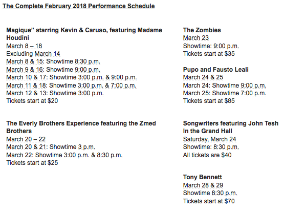 "We are honored to bring a lineup of legendary entertainers and award-winning performers to Fallsview in March," said Cathy Price, vice president, marketing, Niagara Casinos. "Fallsview delivers unforgettable entertainment experiences. From crooner Tony Bennett and songwriter John Tesh, to the Zombies' '60s sound, the Zmed Brother's harmonic celebration of The Everly Brothers, as well as celebrated performances by Pupo and Fausto Leali and the stage spectacular 'Magique.' "
