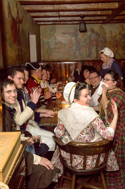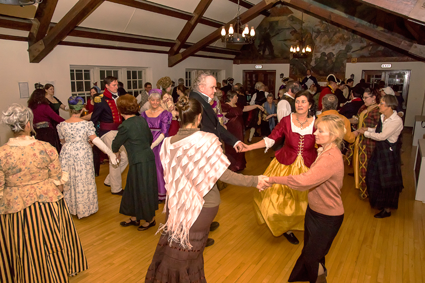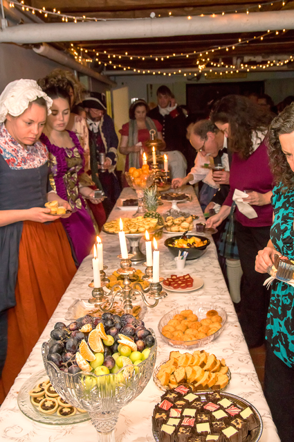 Those in attendance received a piece of cake as they arrived, and the man and woman who found a bean in their cake were named king and queen of the ball. Patrons danced to live period music in the ballroom, and there was food and a tavern with games and more live music "below the stairs."