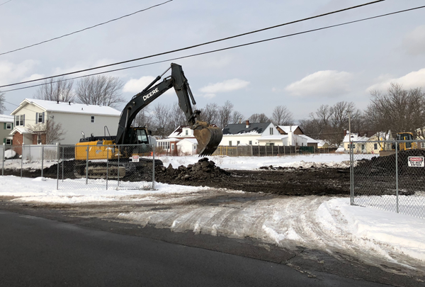 Construction crews earnestly began clearing the ground between Fairchild Place and Onondaga Street this week. The site is being prepped for the building of a three-story apartment complex to the south, and a six-unit townhome development to the north.