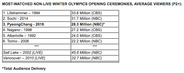 •The NBC television viewership of 27.8 million for the opening ceremony marks the largest audience on a Friday night in four years, a stretch that included four Friday World Series games, two NBA Finals games, three nights of 2016 Rio Olympics coverage, and two nights of the Sochi Olympics.