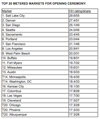 •Opening ceremony viewership on NBC peaked at 31.5 million from 9-9:15 p.m. ET, as Team USA entered during the Parade of Nations.