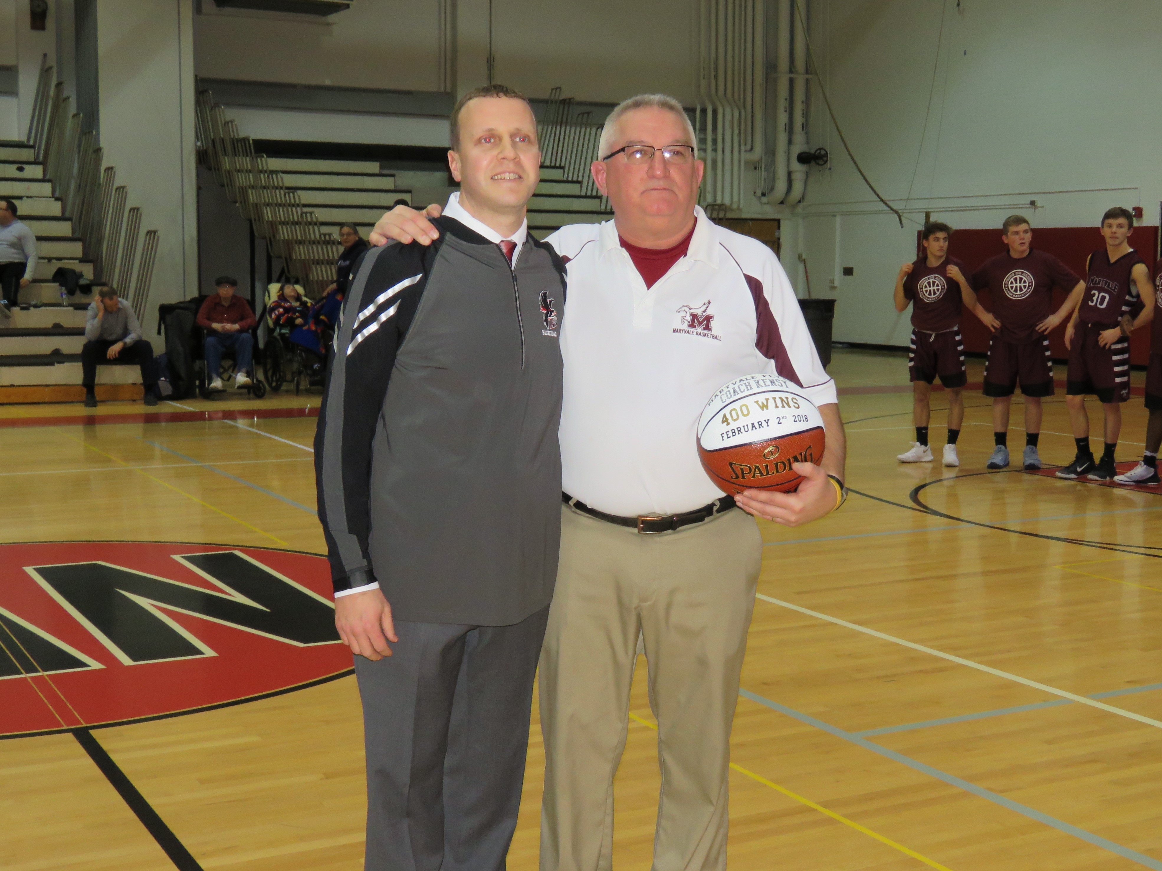 Maryvale coach Mark Kensy (right) and Niagara-Wheatfield coach Erik O'Bryan pose for a picture before Monday night's contest. O'Bryan honored Kensy with a commemorative basketball signifying Kensy's 400th career win, which was earned on Feb. 2 versus Iroquois. (Photo by David Yarger)