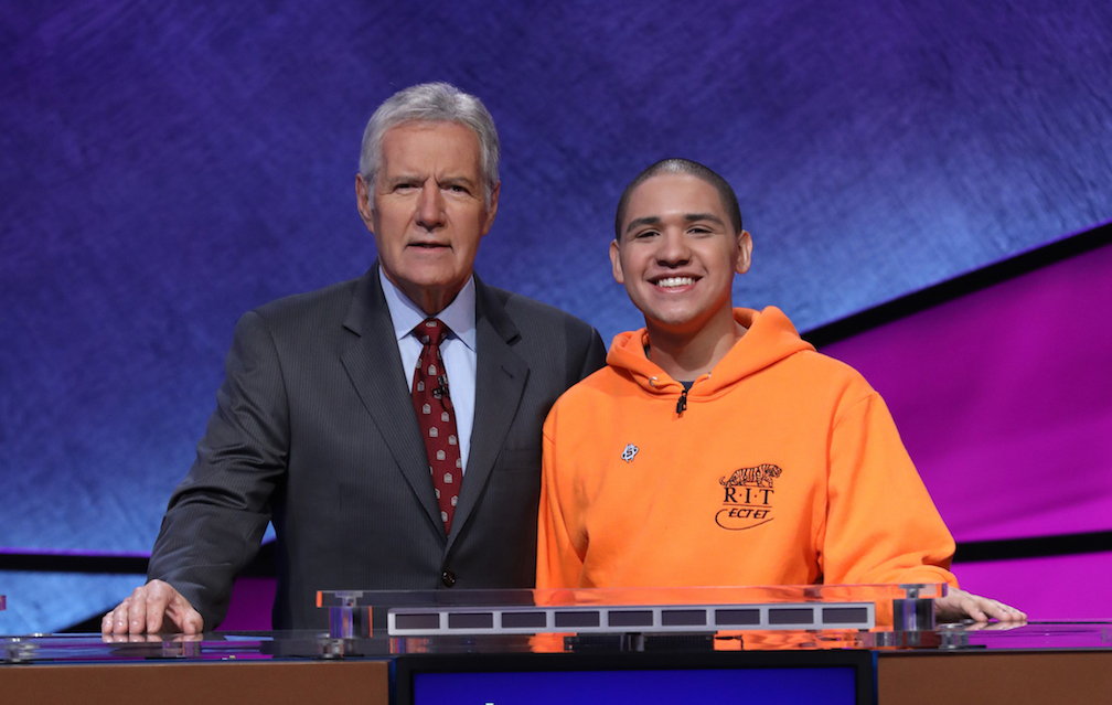 Sheldon Lewis II of Buffalo is a sophomore at the Rochester Institute of Technology. He is shown with "Jeopardy!" host Alex Trebek. (Photo courtesy of Jeopardy Productions Inc.)