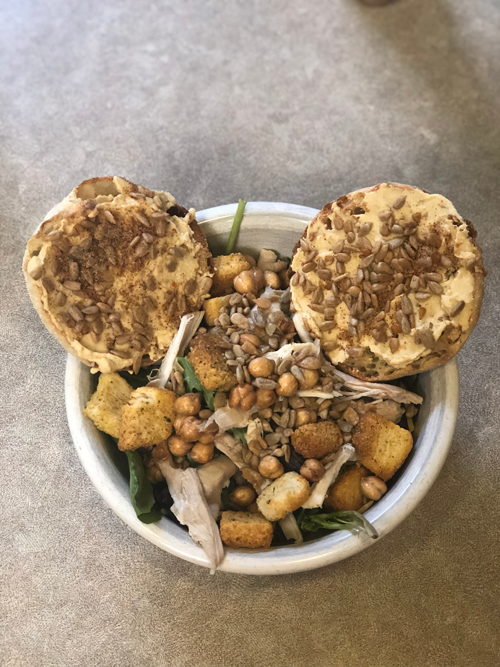 A lunch meal made with an organic spring mix, chicken, sunflower seeds, chickpeas, and topped with a simple dressing. Also paired with an English muffin topped with organic hummus and sunflower seeds.