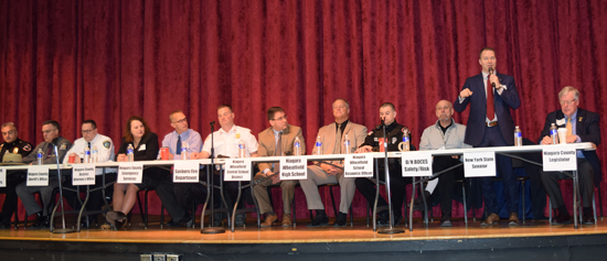 From left: Chief Frank Previte (Lewiston Police Department), Lt. Kurt Schmitt (New York State Police), Chief Deputy Michael Dunn (Niagara County Sheriff's Office) and Grand Jury Bureau Chief Claudette Caldwell (Niagara County District Attorney's Office), Emergency Management Director Jonathan Schultz (Niagara County Emergency Services), Fire Chief Rob Hoover (Sanborn Fire Department), Superintendent of Schools Daniel Ljiljanich (Niagara-Wheatfield Central School District), High School Principal Michael Mann (Niagara-Wheatfield High School), School Resource Officer Robert Rougeux (Niagara-Wheatfield Central School District), Safety Specialist Leon Szczerbinski (Orleans/Niagara BOCES), Sen. Robert Ortt (New York State Senate) and Chairman of Public Safety David Godfrey (Niagara County Legislature).
