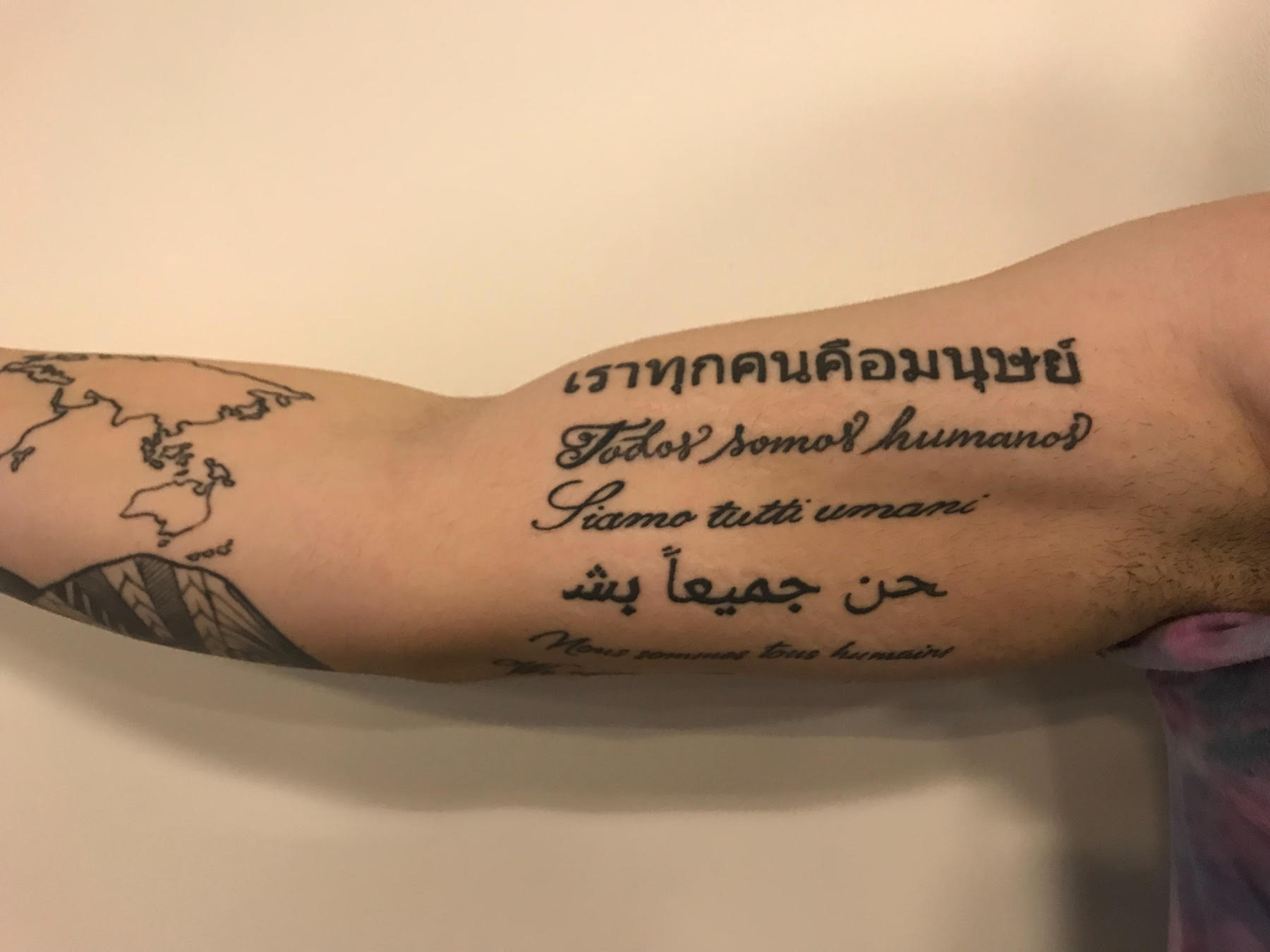 "Any country I've been to, I've got it in that language: Spanish, Dutch, German, Swedish, Italian, Arabic and Thai. After I've been to more countries, it's going to wrap around, and the top of the sleeve is done."