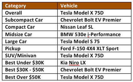 In 2018, the following vehicles earned AAA's Top Green Vehicle award:
