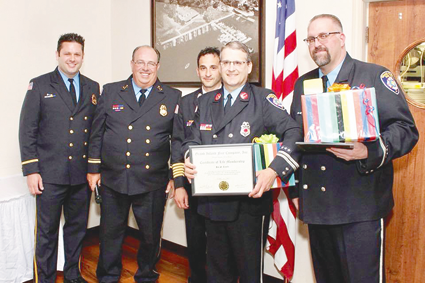Grand Island Fire Chief Chris Soluri, Board Chairman Peter Sukmanowski and President Michael Dallessandro are pictured with Nicole Gerber as she received a 10-year service award from the Grand Island Fire Co.