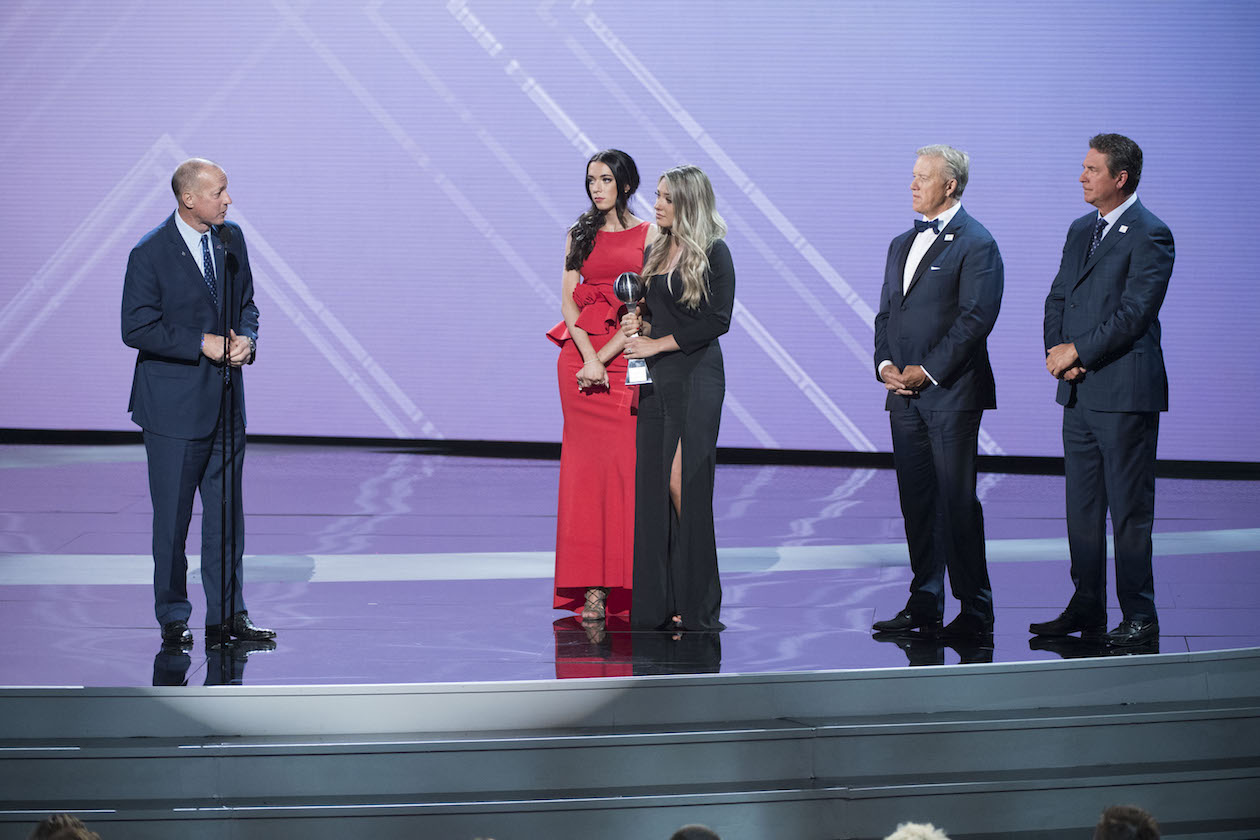 Jim Kelly delivers his speech as daughters Camryn and Erin look on. To the far right are Kelly's friends, NFL Hall of Famer quarterbacks John Elway and Dan Marino.