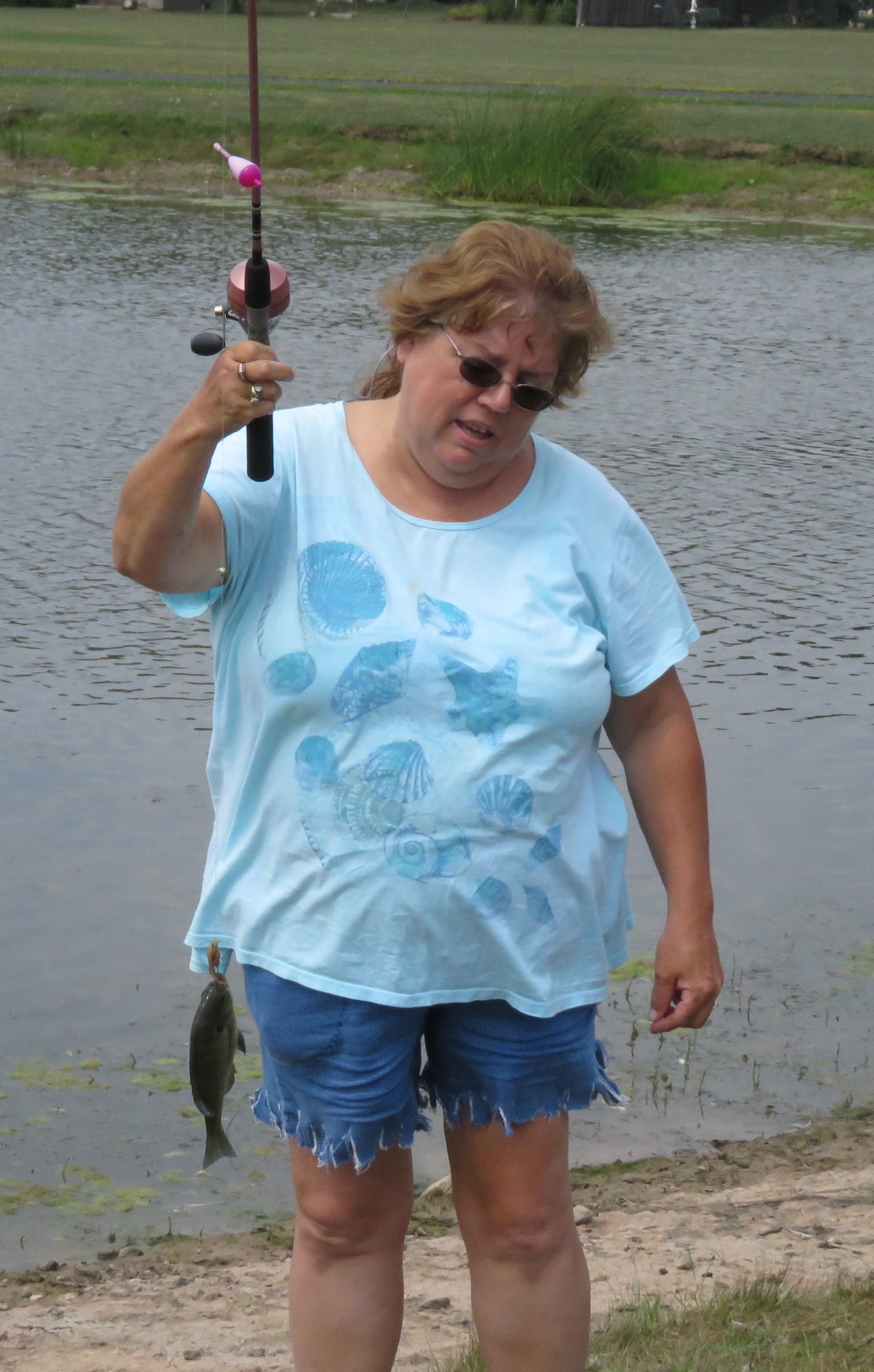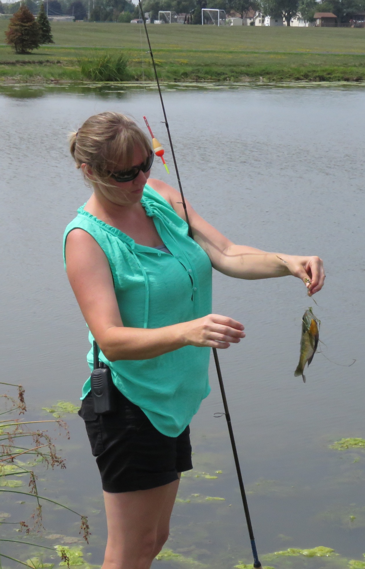 Recreation Clerk Brandi Ealy takes a look at the fish she caught.
