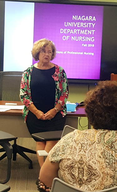 Niagara University School of Nursing Director Fran Crosby, Ed.D., R.N., welcomes the first cohort of enrolled nurses to Niagara University nursing classes being taught at Niagara Falls Memorial Medical Center.