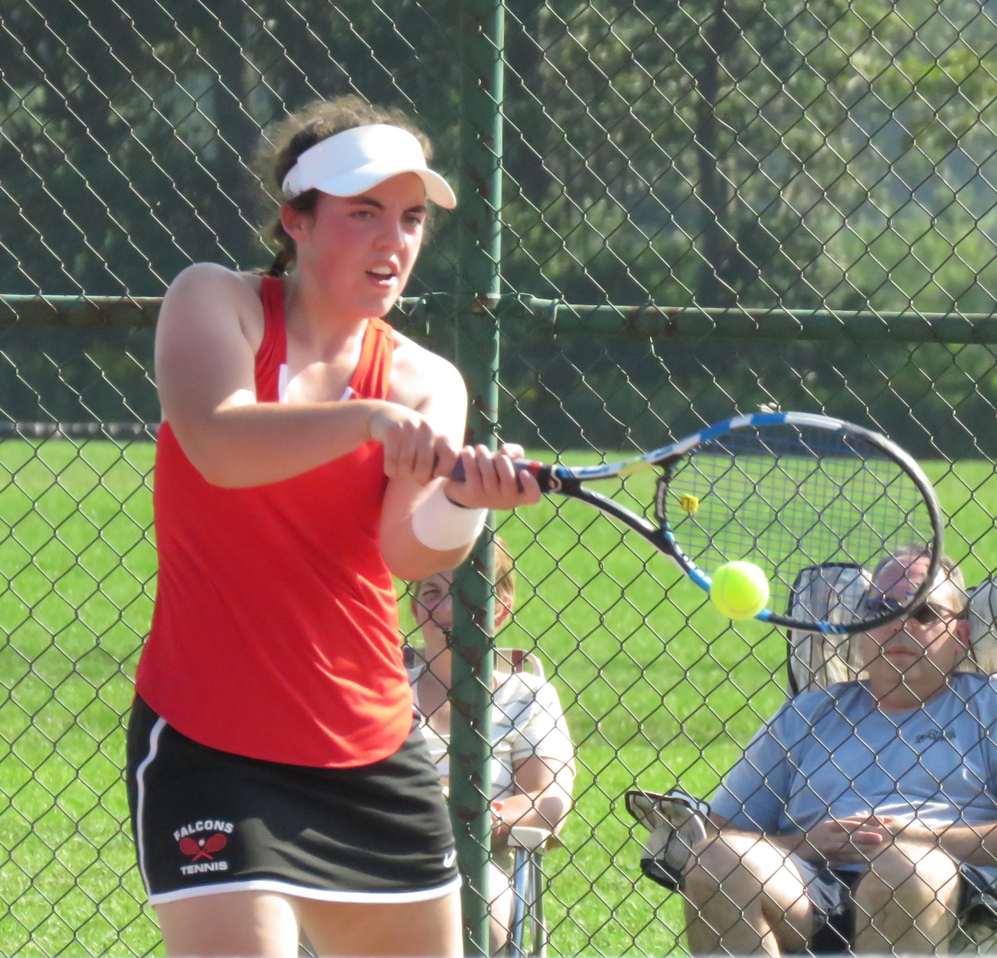 Nicole Guldin hits a backhand shot during Tuesday's match versus Grand Island. Guldin won her match in two sets (6-4, 6-4).