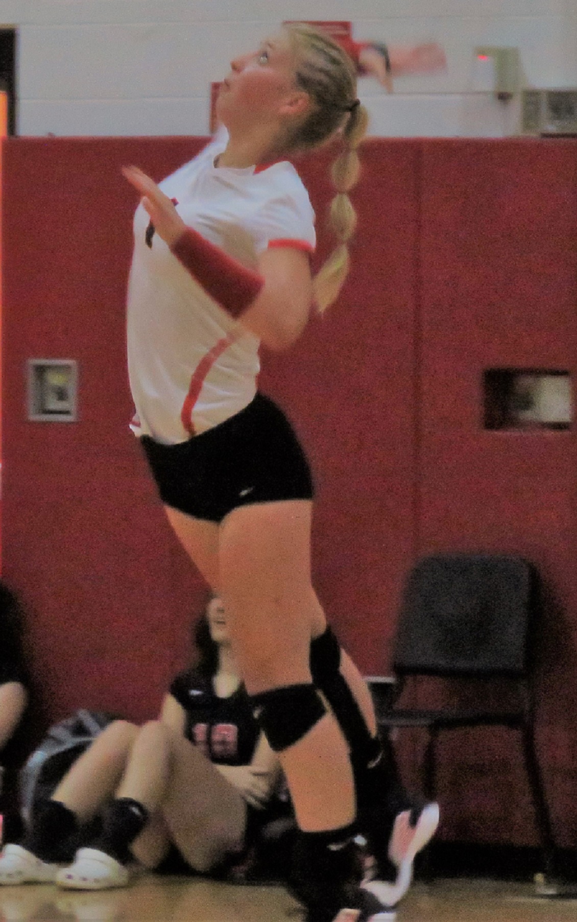 Jenna Sonnenberg serves for the Lady Falcons volleyball team during Tuesday's league opener versus Lockport. Sonnenberg had 12 digs in the Falcons 3-0 victory.