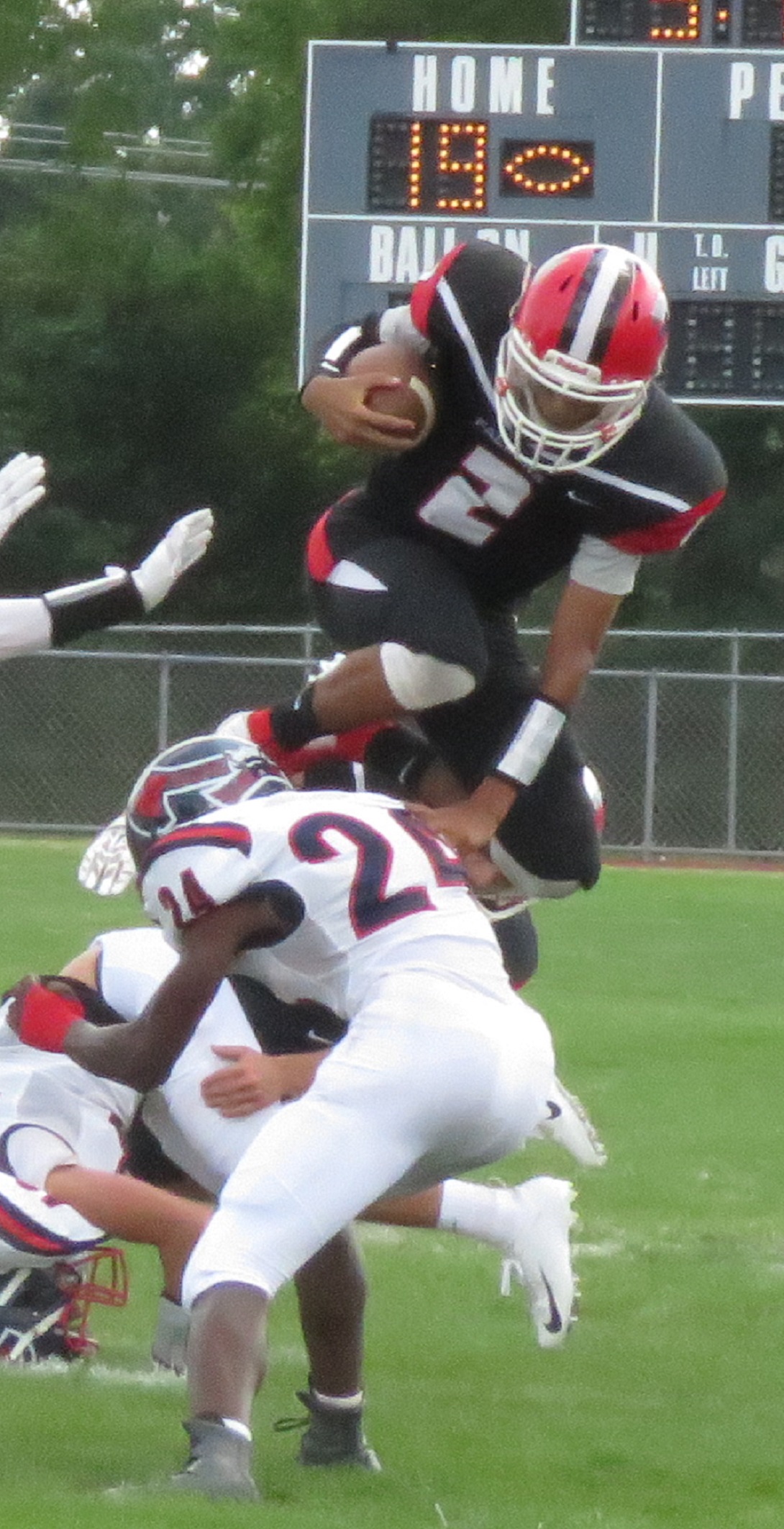 Up, up, and away: Jordan Parks hurdles a defender during Saturday's game.