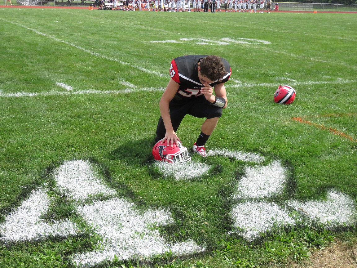 The Falcons gather before the game for a prayer on the painted No. 42.