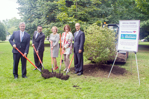Alan Bozer, Joel Feroleto, Carol Sampson, Stephanie Crockatt and Kevin Murphy are pictured next to a newly planted Kousa dogwood tree commemorating the groundbreaking of the Rumsey Shelter restoration.