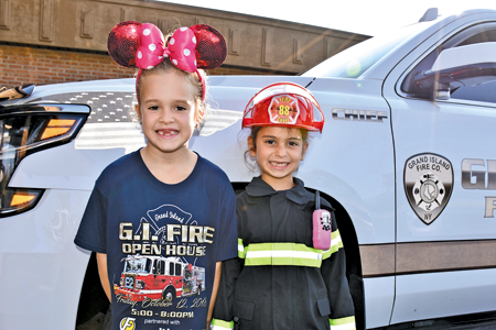 Verelynn and Sophia wear the new T-shirts and firefighter gear. Fuccillo donated the shirts for students who are undergoing fire safety training this week.