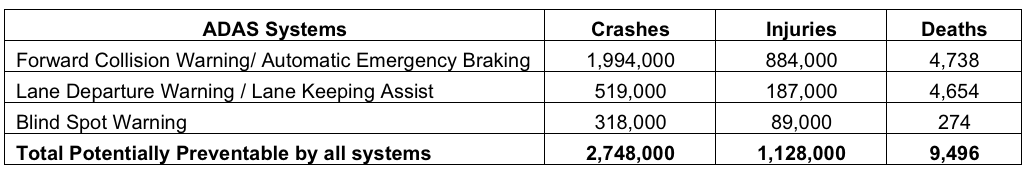 As part of its ongoing traffic safety mission, new AAA Foundation research also evaluated the potential these popular advanced driver assistance technologies have in helping to reduce or prevent crashes. The findings show that, if installed on all vehicles, ADAS technologies can potentially prevent more than 2.7 million crashes, 1.1 million injuries and nearly 9,500 deaths each year: