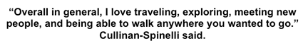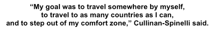 Cullinan-Spinelli chose to study abroad in Europe. She and two other girls traveled to Rome, Seville, and Paris for 6 weeks. It has always been a goal to study abroad for her since her older siblings did it as well, intriguing her from their great experiences. Choosing to also study during the months of January to May, Cullinan-Spinelli made it her goal to set out on her own venture. "My favorite thing was going on a trip by myself. I went to Austria all alone without any plans except for my transportation to Austria and back.