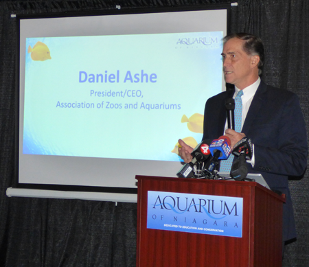 AZA President and CEO Daniel Ashe was on hand to present a plaque to Aquarium of Niagara Executive Director Gary Siddall. Other speakers included City of Niagara Falls Mayor Paul Dyster and Destination Niagara USA Director of Operations Andrea Czopp.