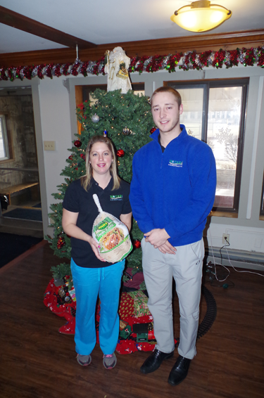 Notaro Chiropractic Assistant Office Manager Jenn Paonessa and Dr. Aaron Boddecker are pictured at the Christmas tree inside Community Missions of Niagara Frontier on Buffalo Avenue in the City of Niagara Falls, where they delivered a turkey.