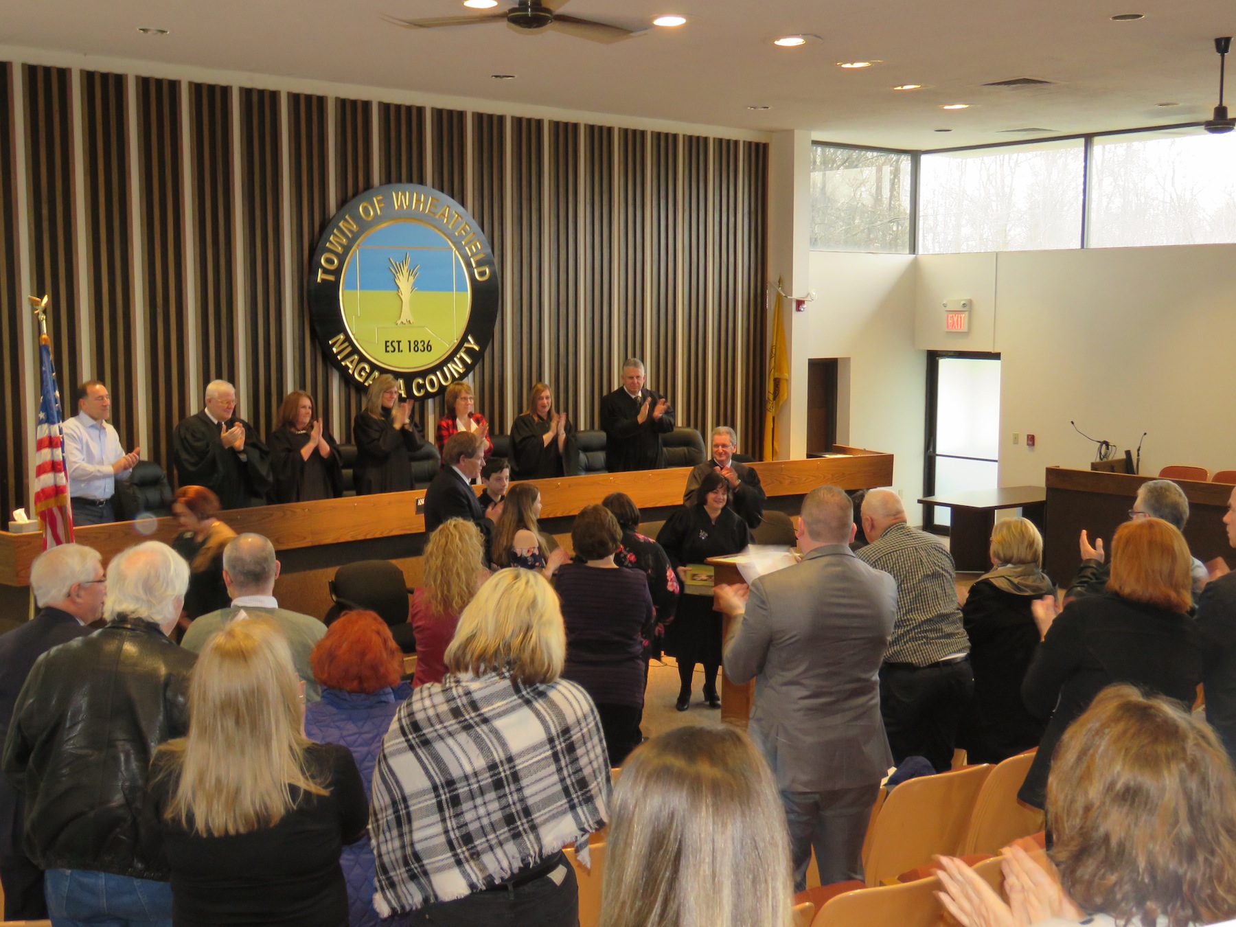 The audience at Wheatfield Town Hall stands and cheers as Stamm-Philipps is officially recognized as town justice.