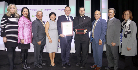 Vaughan Mayor Maurizio Bevilacqua presents Niagara University President Rev. James J. Maher with the key to the city on Feb. 15, alongside the Vaughan City Council.