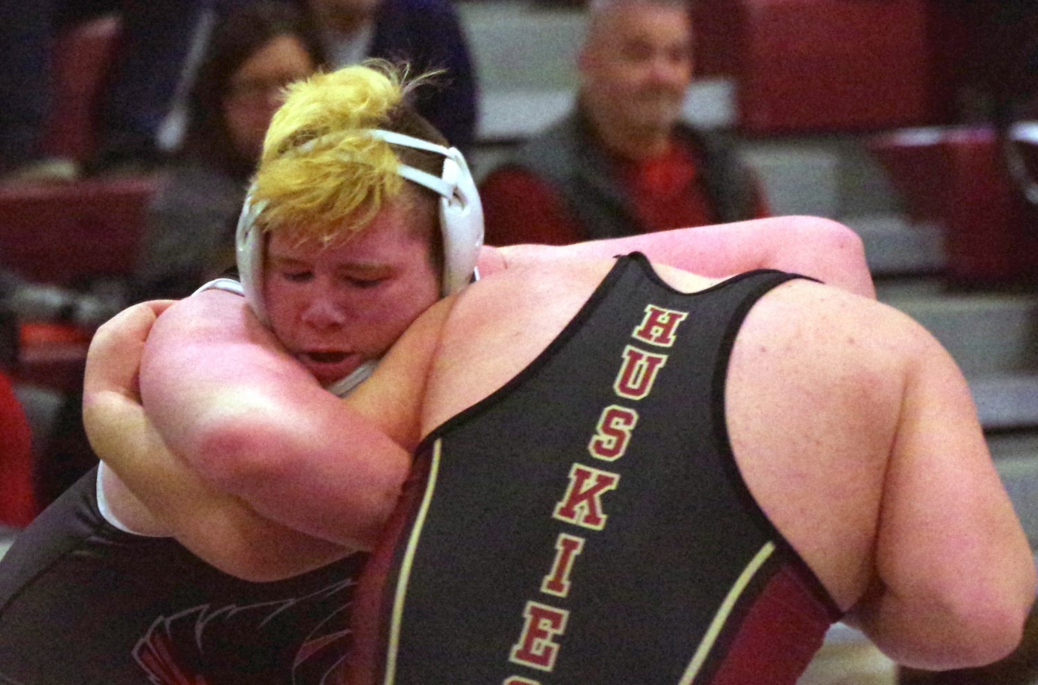 Kevin Halford squares off against Olean's Tanner Hulse in the 285-pound class championship. Halford went on to finish second.