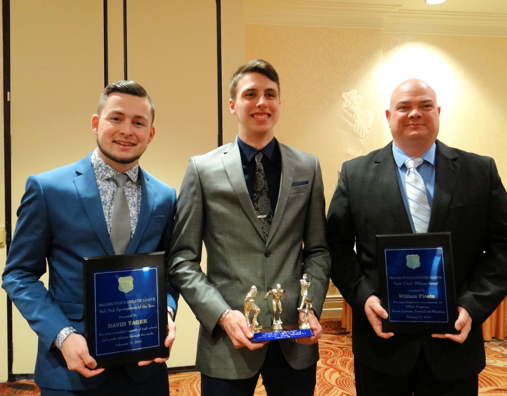 From left, David Yarger, Tribune editor; Thomas Peltier of Niagara-Wheatfield football, swimming and baseball; and William Ploetz coach with Niagara-Wheatfield Falcons wrestling and Niagara-Wheatfield Amateur Athletics pose following an awards ceremony at the Niagara PAL annual awards dinner.