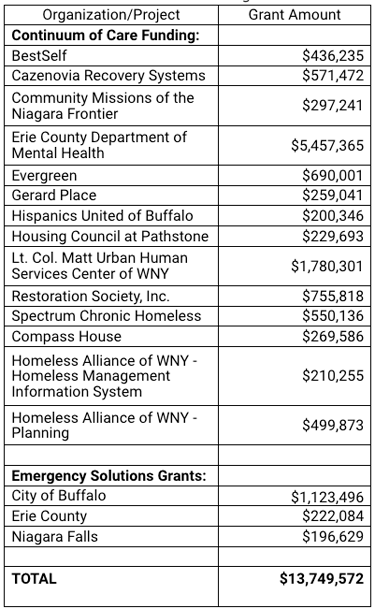Higgins said, “These federal grants that our local agencies have won through the Department of Housing and Urban Development will be instrumental in expanding critical services and continuing to fight homelessness in Western New York. We are fortunate to have, in the Homeless Alliance of WNY, a coordinated effort led by able local agencies and government partners committed to not only home placement, but a real focus on addressing the challenges that leave people without a home.”