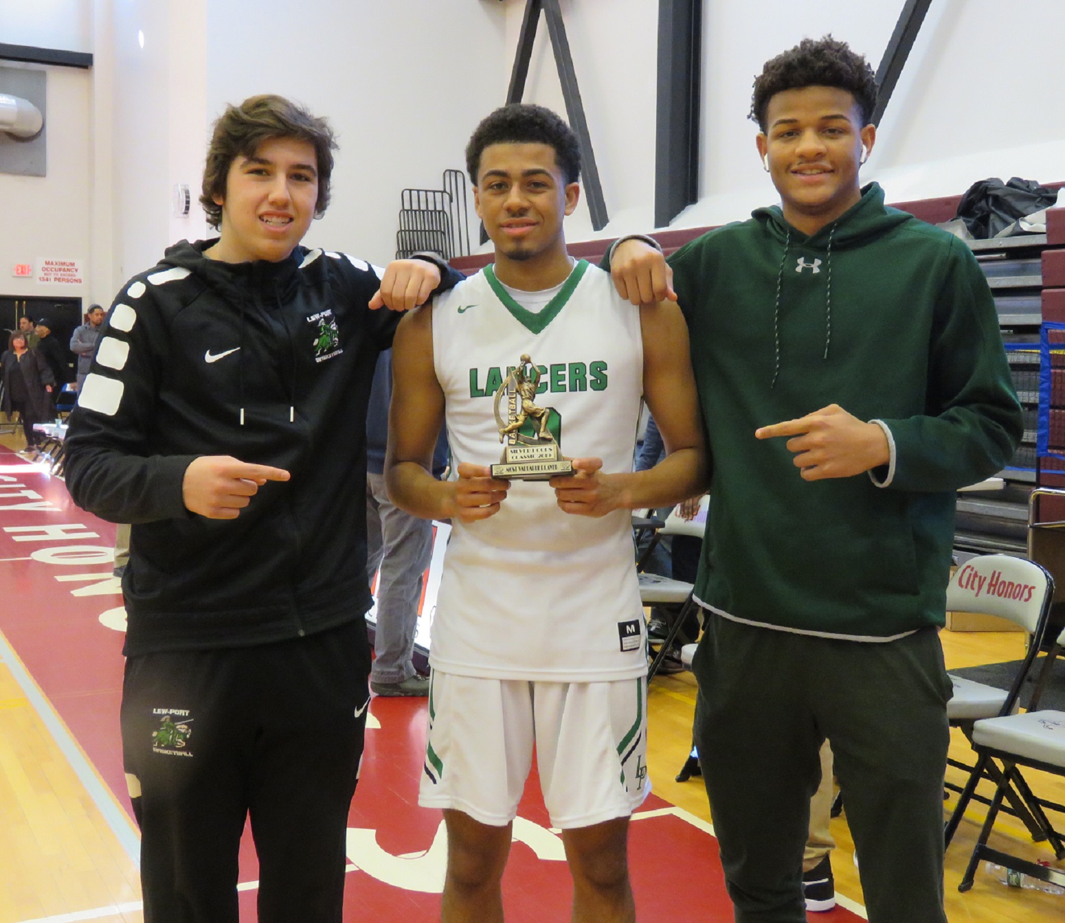 From left, Jack Bernstein, Trent Scott and Roddy Gayle of Lewiston-Porter pose for a picture following the Silver City Hoops Classic