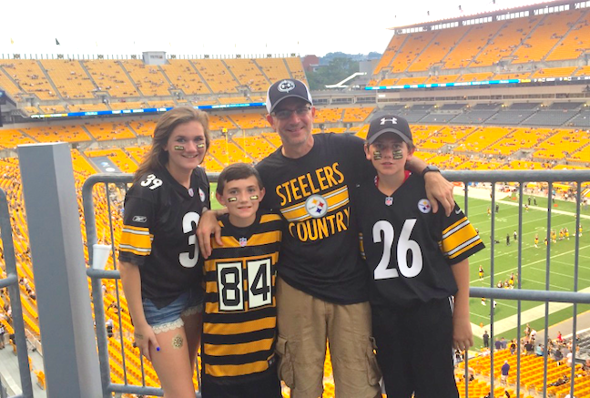 My dad and my brothers and I at a Steelers game a couple of years ago after he got help.