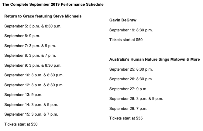 From Sept. 25-29, Australian vocal quartet Human Nature “Sings Motown & More” will light up the stage with their unique harmonies. This group has sold more than 2.5 million albums, earned 25 Platinum awards, and has five Top 10 tracks worldwide. Human Nature will showcase hits such as “Reach Out I'll Be There,” “Don't Say Goodbye” and “Baby I Need Your Loving.”