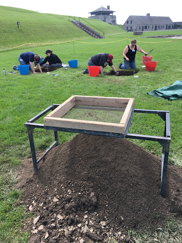 Anthropology students from SUNY Buffalo State College are spending time at Old Fort Niagara this month. They are participating in an archaeological field school that is actively excavating Building 428, a barracks spanning the years 1756-1813 near the North Redoubt. Built by the French in 1756, it disappears from maps and plans in 1814 without records of why or how. The barracks housed soldiers while they were garrisoned at the fort.