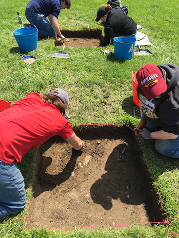 Three 1-meter-square test units are being excavated and studied by the students who spend hours scraping away layers of dirt in search of artifacts.