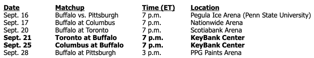 Among their other five games, the Sabres will play three road games and a neutral-site contest at Pegula Ice Arena at Pennsylvania State University on Monday, Sept. 16, against the Pittsburgh Penguins.