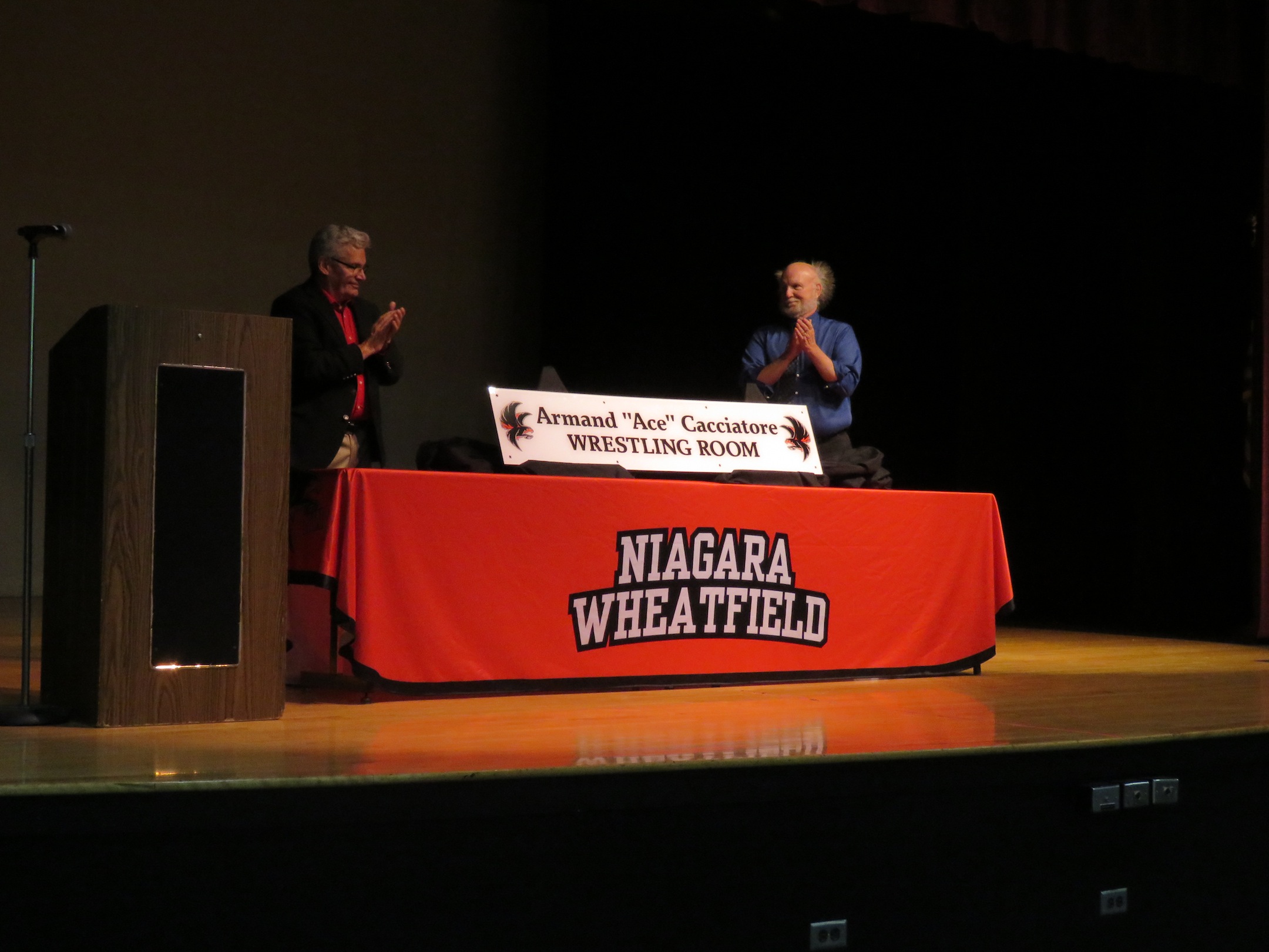 Cacciatore also mentioned the lengths he went to promote the sport of wrestling at Niagara-Wheatfield. He said he’d post results at the front of the school for students to see; “Falcons Doors” that wrestlers would come through during matches; wrestling presentations at a local bank; classes for grade school children; a “wrestling gong” that wrestlers could bang after they pinned an opponent; and a customized wrestling mat donning the N-W colors, amongst many things.