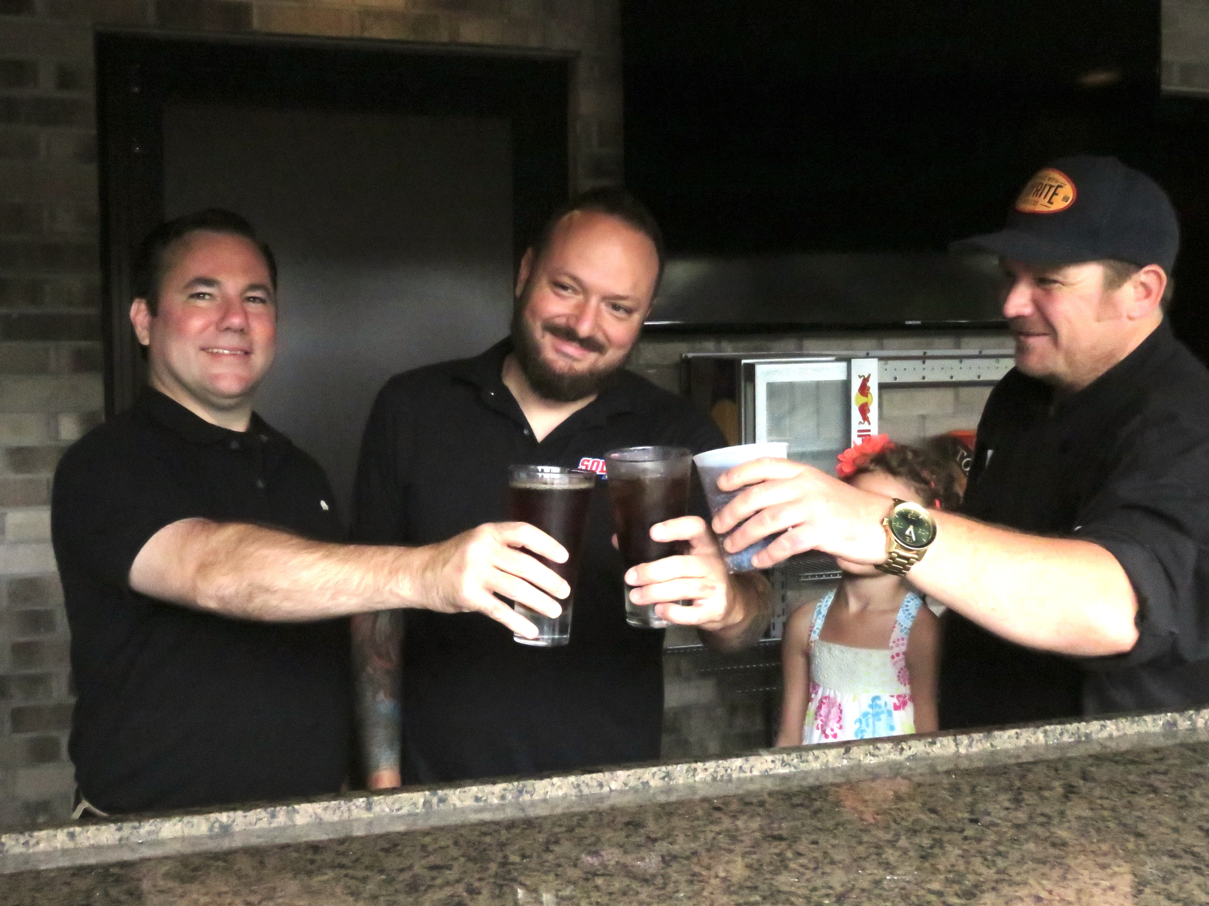 From left, partner Sean MacKenzie, Denny Soliday and chef Jeff McMahon say cheers to a new beginning in Wheatfield.